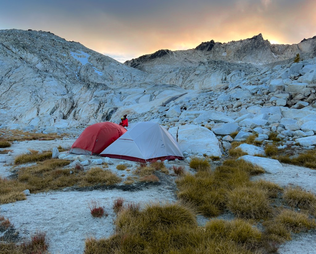 The decision of breaking at Isolation lake turned out to be a good one for us as we got enough time to set up camp and experience a beautiful sunset. It got super chilly and windy soon after sun down so much so that the outer layers of our tents kept flapping throughout the night. Our hand and feet warmers helped us get some much needed sleep.