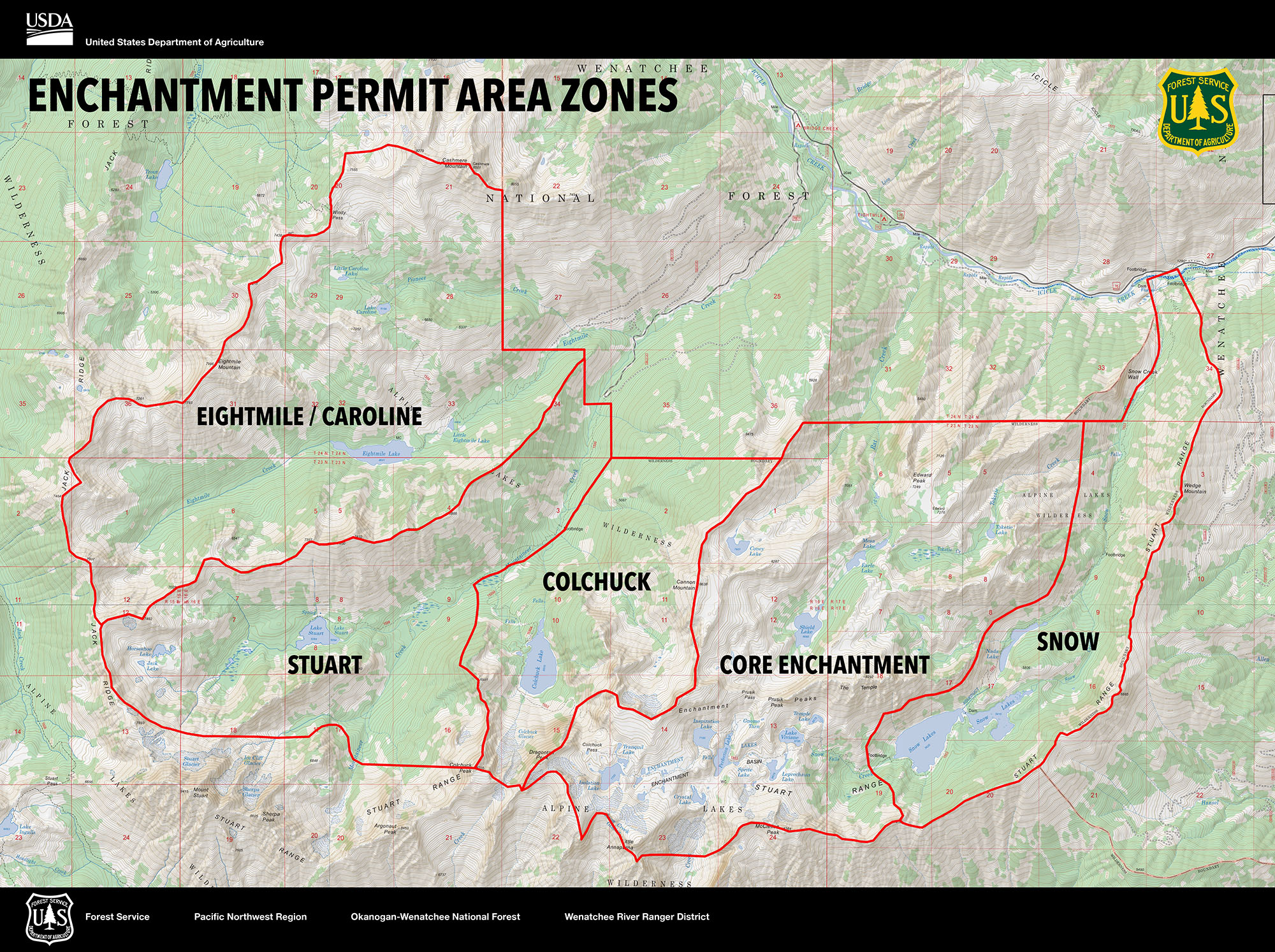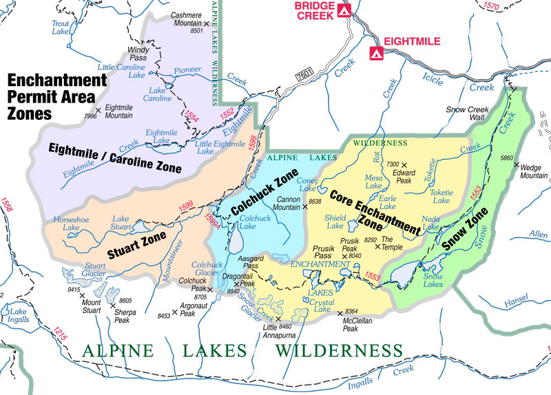 Map of the Enchantments Zones & trail showing Snow lake, Core Enchantments, Colchuck, Stuart & Eightmile areas. Source: fs.usda.gov