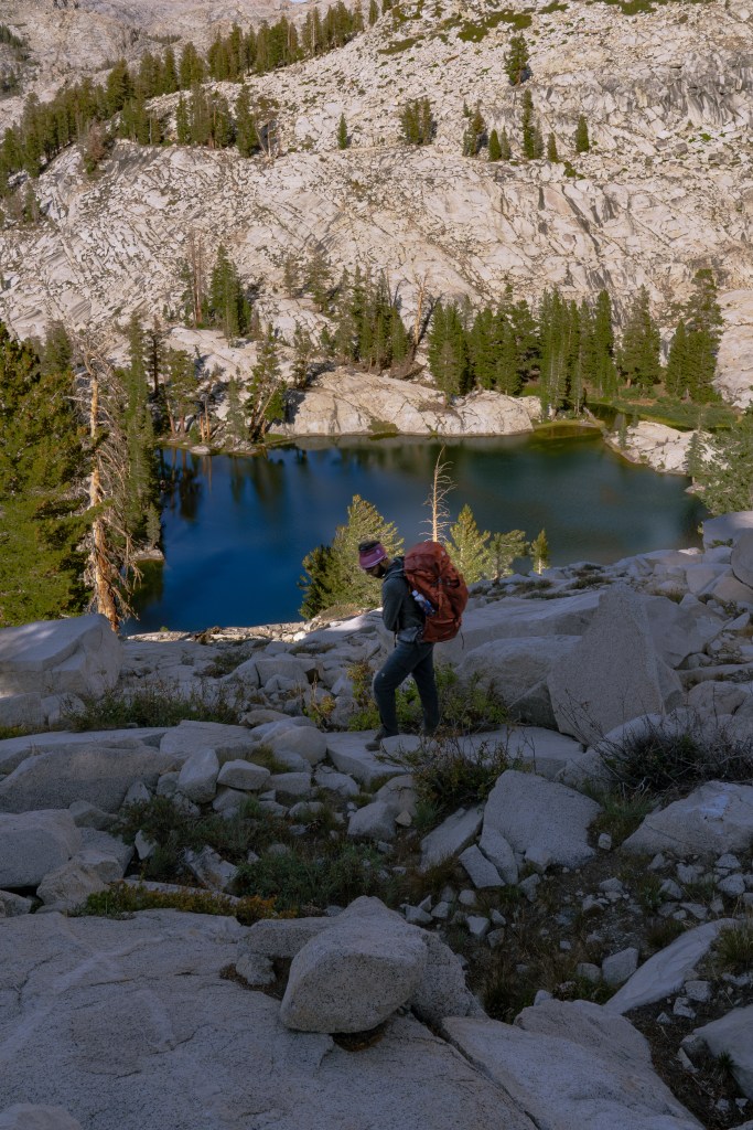We picked up pace from here and after about 0.5 miles views of Aster lake with its deep blue color started showing. Unlike the other lakes there is no established trail down to Aster lake – at least that’s what it seemed like to us. The lake sits about 200ft below the trail with a backdrop of beautiful granite cliffs. Camping is not permitted here.