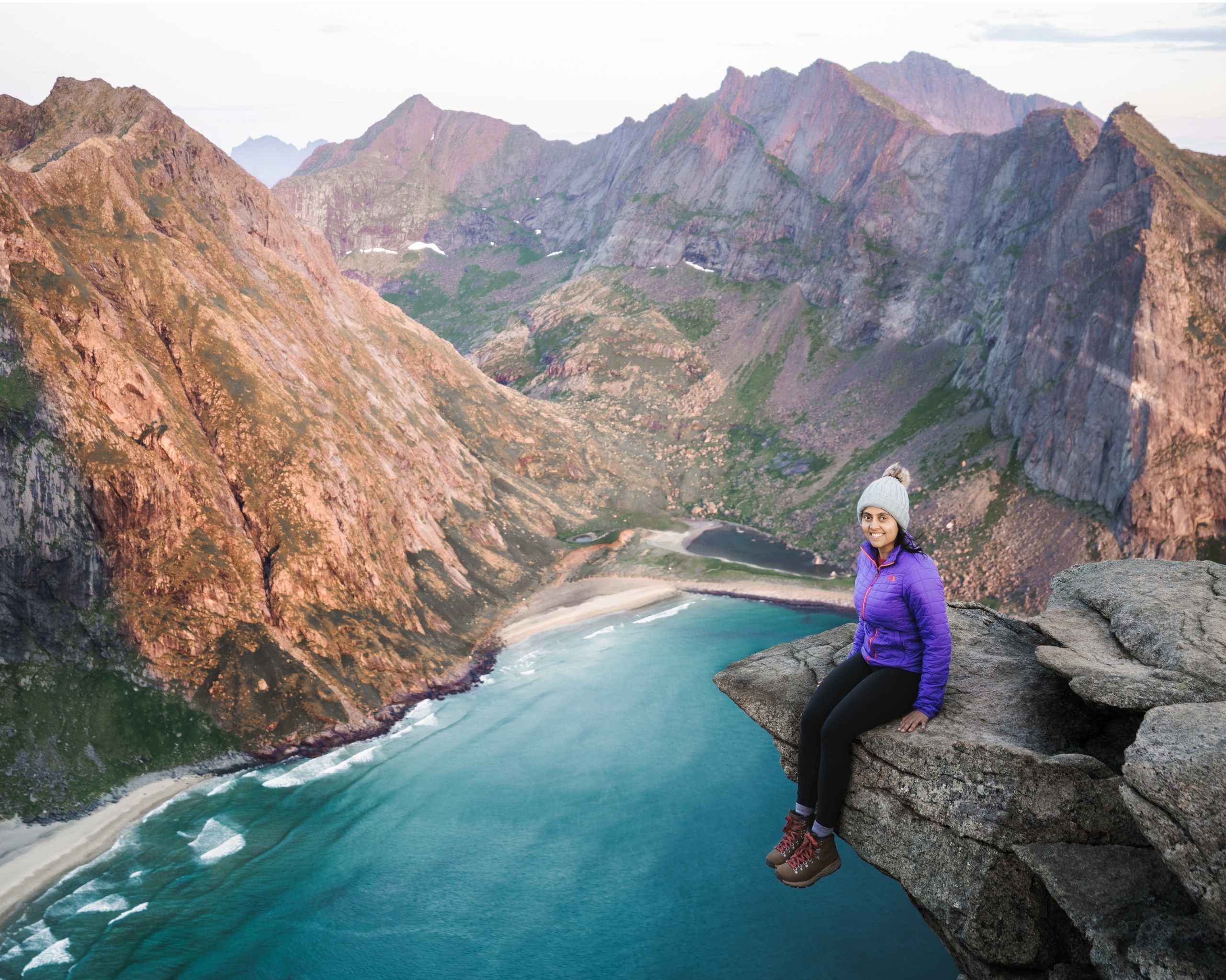 This has been our personal favorite on the Lofoten Islands. Not too crowded if hiked late at night during summer months and brilliant, expansive views right from start. The contrast of emerald green waters of Kvalvika beach against the surrounding craggy peaks are views worth witnessing at least once in a lifetime. If you are like us and stop often to admire views and take pictures, then we highly recommend allocating more time for this hike.