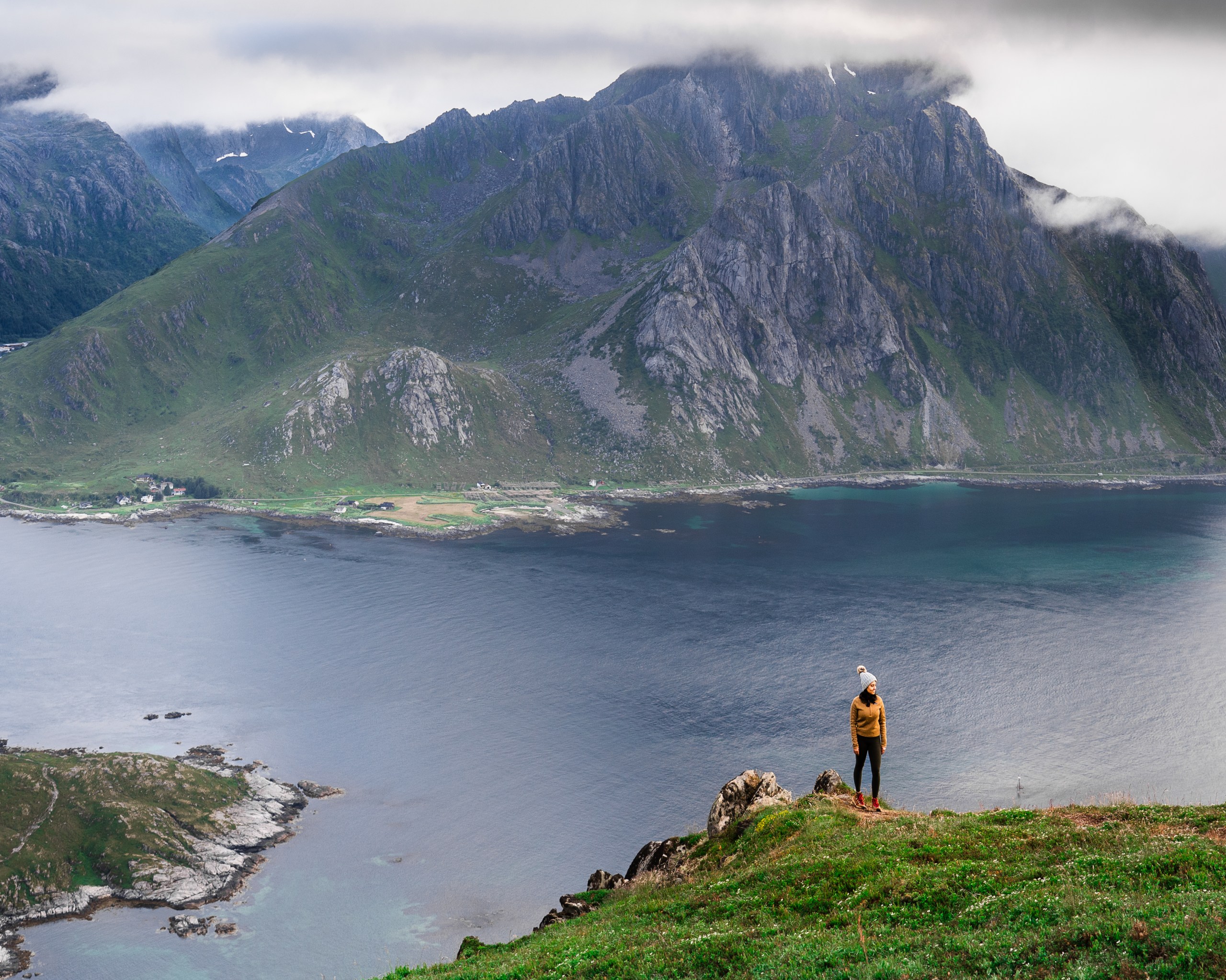 At the summit, you get panoramic views of mountains surrounding the beautiful fishing village of Hennigsvær. See if you can spot the famous soccer field of Hennigsvær known to be one of the most picturesque soccer fields in the world! This hike with it’s views is a typical representative of hikes on the Lofoten islands. This is a great option if you have some time in hand when exploring the Svolvær-Hennigsvær region and looking for a warm up hike.